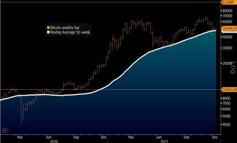 2021年年底的一大關鍵問題是,比特币市場是否過熱。比特币在2020年結束的價格比其年均值約高出140%。圖表顯示,比特币價格在其上升的50周移動均線附近,仍較為合理,不太長的上升通道将為2022年的強勁增長奠定基礎。