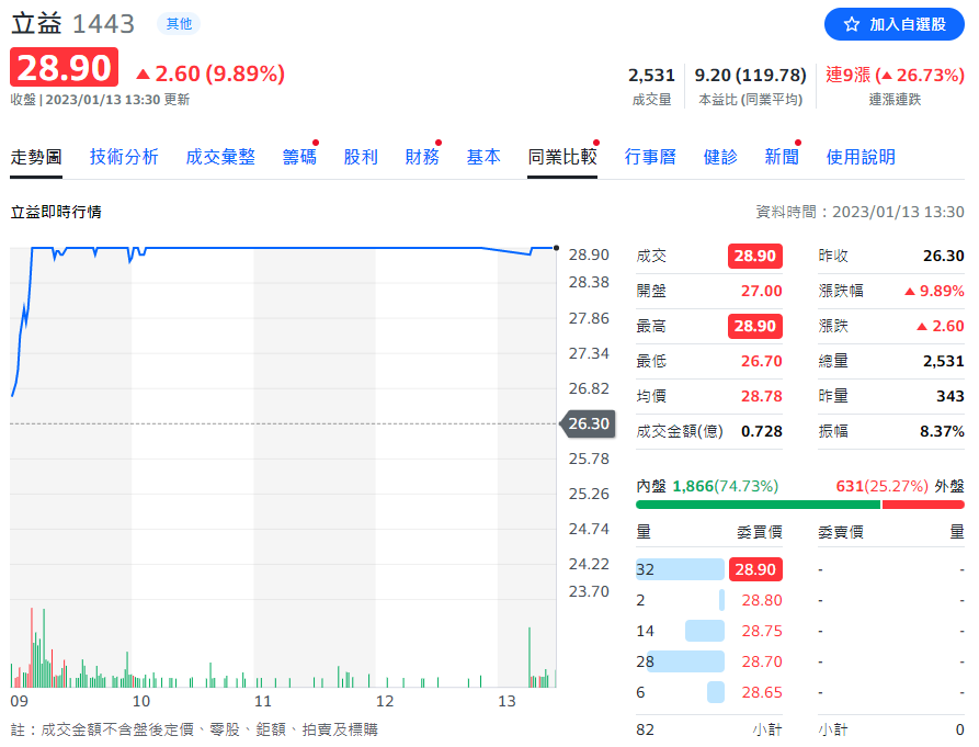 #立益(1443):物流事業無虞,今年業績穩揚,早盤亮燈漲停、改寫前高。