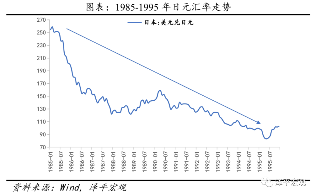 “廣場協議”簽訂之後,五國開始在外匯市場拋售美元,帶動了市場投資者的拋售狂潮。美元因此持續大幅度貶值,而世界主要貨幣對美元匯率均有不同程度的上升。其中,日元的升值幅度最大,三年間達到了86.1%。