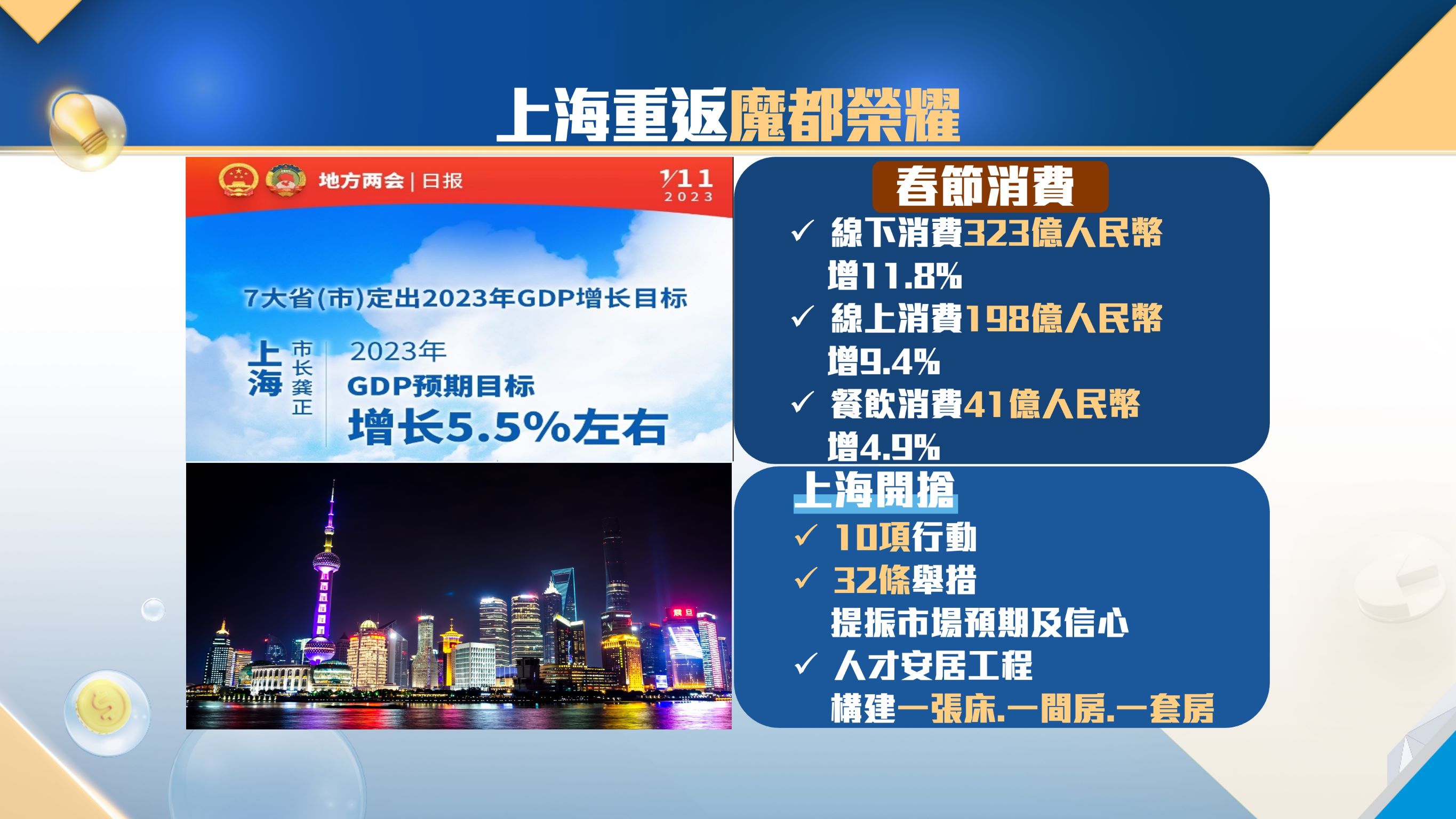 隨著防疫放鬆,中國消費市場逐漸復甦;中國經濟第一大重鎮:上海春節期間線上和線下消費總額達人民幣521億元。據消費市場大數據實驗室(上海)監測顯示,春節假期7天(20日至26日),上海全市線下消費達323億元,較節前提升11.8%(與13日至19日7天相比)。餐飲消費達41億元,年增4.9%;線上消費為198億元,年增9.4%。