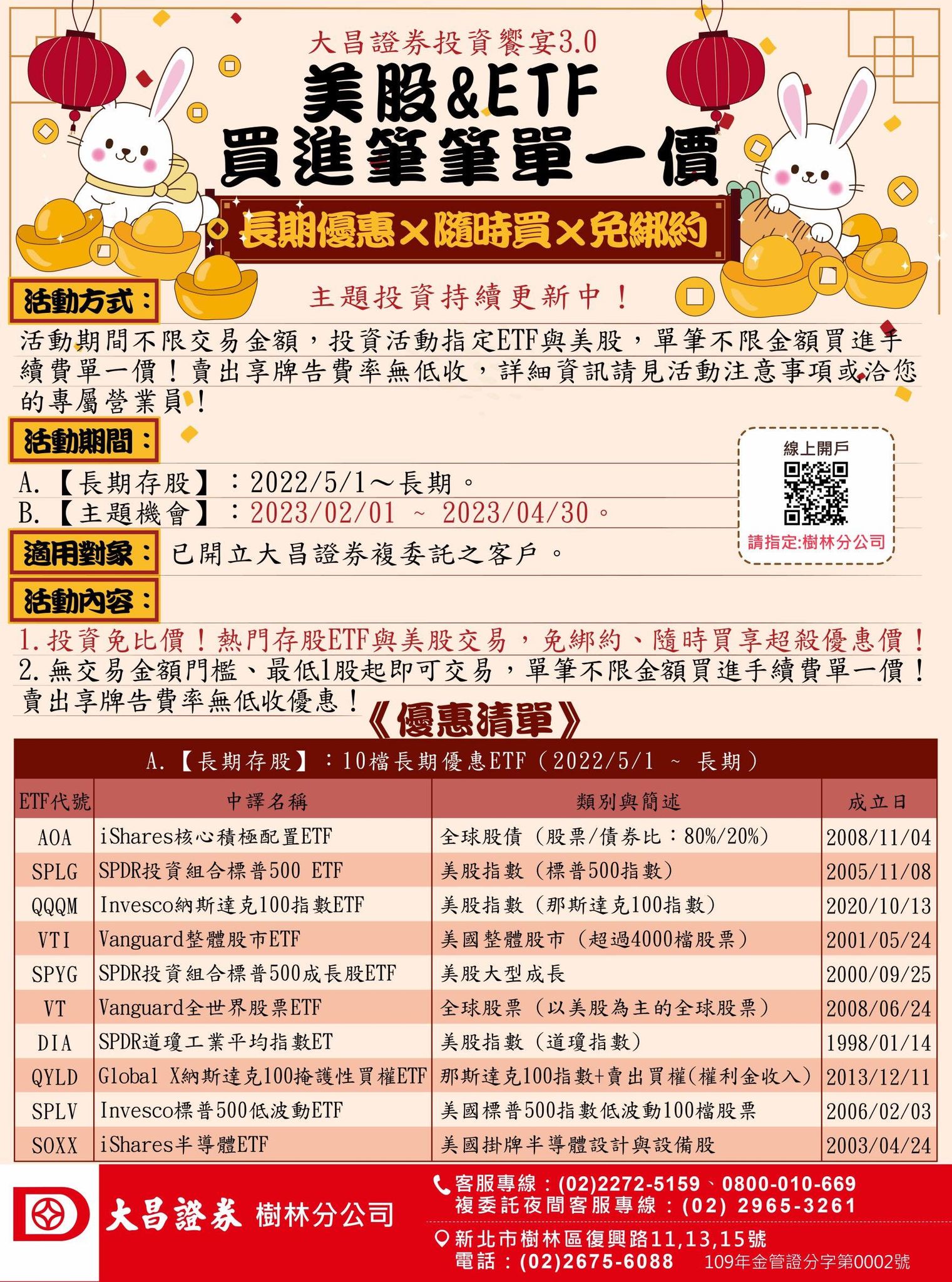 【大昌證券投資饗宴3.0!】 精選30檔美股與ETF手續費優惠標的將於2月更新!