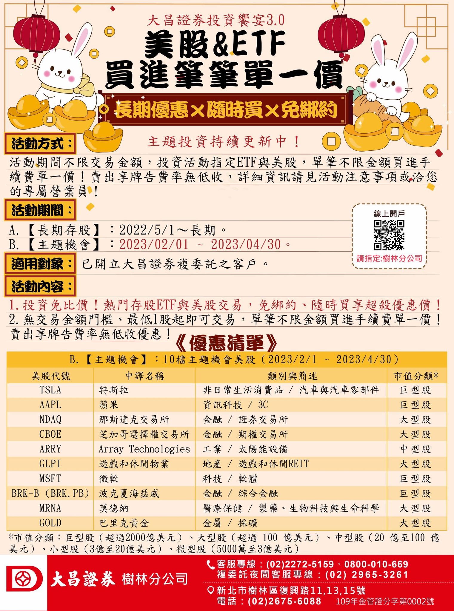 B.【主題機會】10檔美股&10檔ETF:活動期間:2023/02/01 ~ 2023/04/30。