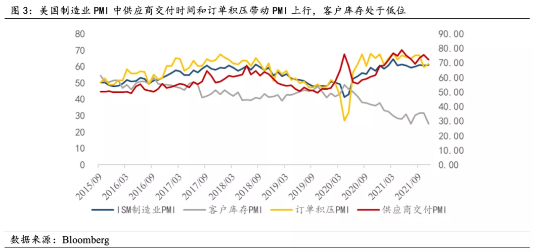激增的收入使消費得到支撐,從2020年5月開始,美國零售總額迅速回升,供給缺口逐步擴大,庫存對零售銷售比率降至低位。 儘管2021年前8個月的進口量創下了記錄,但美國零售業的速度仍然超過了庫存補充的速度,其中傢俱、電子產品和建築產品等商品的消費水準保持高位,根據美國人口普查局的最新數據顯示,庫存與銷售比已降至1992年該數據首次公佈以來的最低水準。 此外,製造業PMI分項中訂單交付時間與訂單積壓程度上漲,保持在60以上水準,客戶庫存處於低位,維持在30左右。 各類指標表明補貼刺激下的需求激增是供應鏈問題的主要誘因。