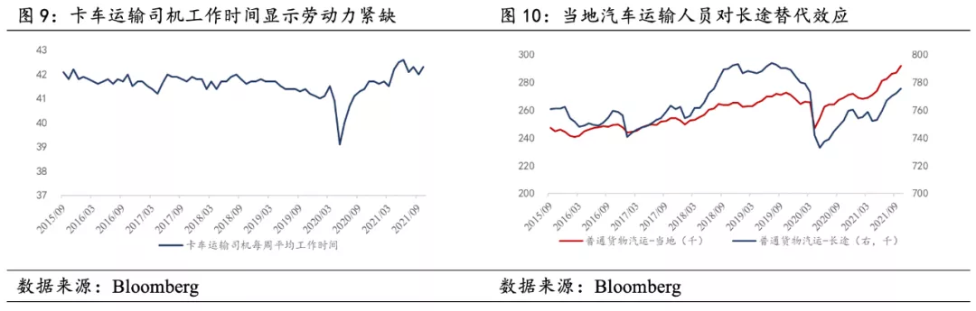 疫情擔憂和需求激增是司機缺失的另一個原因。 一方面,對疫情的擔憂導致短途司機對長途司機的替代效應體現,從數據上看,當地貨運人員就業修復較為順利,而長度運輸就業人員則依然處於低位。 另一方面,陸運需求激增導致長途司機供不應求,司機的就業人數不斷抬升,但職位空缺人數也持續上漲,工作時長保持高位。