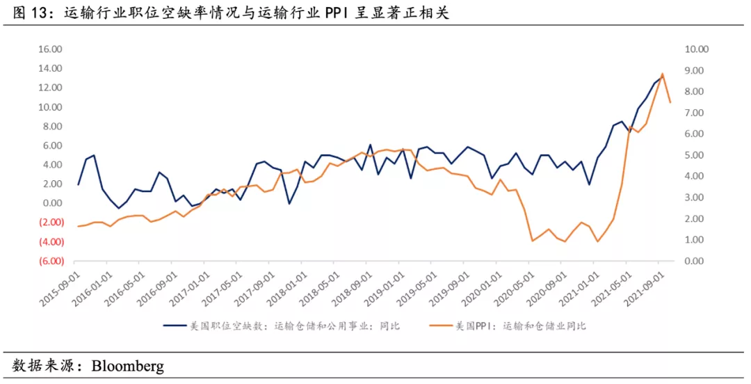 運輸行業工作力短缺情況與運輸倉儲行業生產成本呈現顯著正相關,出口貨物的運輸和倉儲PPI中,2020年短途機車運輸佔比16%,長途機車運輸佔比47%,貢獻主要部分。 卡車司機工作力短缺下,運輸供需矛盾激增,運費價格上漲。