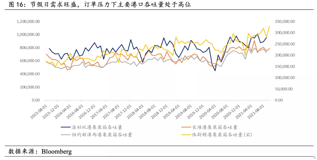 淨進口量方面,美國零售銷額、成屋和新建住房銷售量均在環比正增長,隨著Q4公休日的密集到來,漲價潮和耶誕公休日更是推升搶購情緒,加劇美國庫存短缺和貨物進口需求,進口壓力依然較大。 從美國四大港口的輸送量均處於上漲趨勢,其中休斯頓港口輸送量達到2015年以來新高。