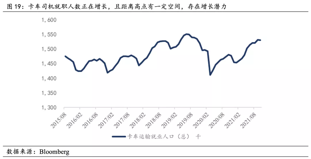 在整體層面上,美國就業已經開始修復,初請與續請失業金人數數周逐步下行,失業率下行至4.2%,接近疫情前水準,工作力緊缺正在緩解,同時,卡車司機就職人數正在增長,且距離高點有一定空間,存在修復潛力。