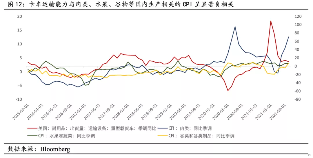 肉類、水果、穀物等商品主要為美國國內生產,在供應鏈擁堵的情況下,卡車出貨量成為食品供需矛盾的核心要素,與食品價格CPI分項呈現顯著負相關。