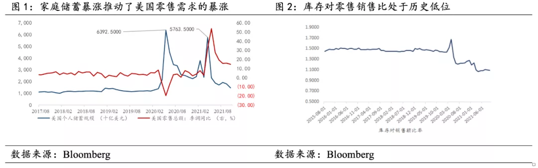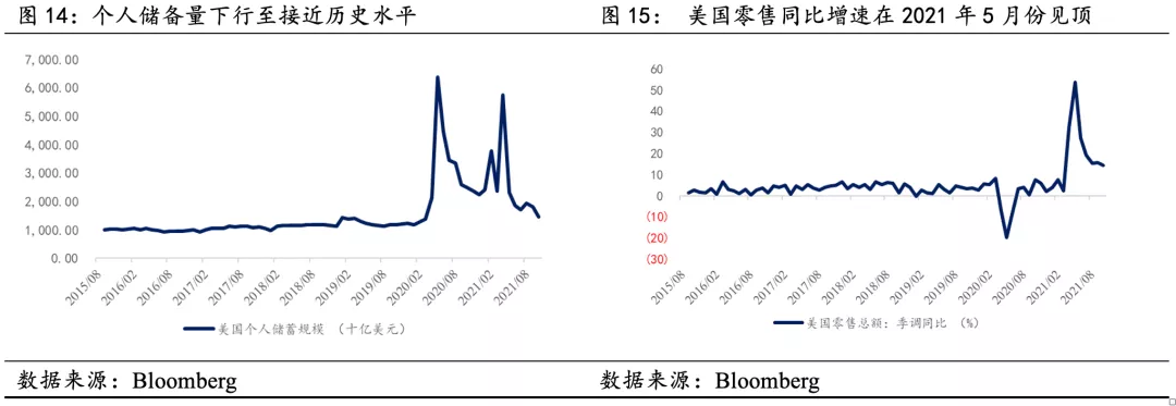 在前文分析中,我們提到供應鏈問題的誘導因素是財政補貼下的居民儲備與消費需求激增。 從這一維度上看,財政補貼的失業救濟金在9月份到期,個人儲備規模下降至接近1.1萬億美元的歷史平均水準,商品型消費需求下降,美國個人耐用品消費支出已經觸頂回落。 未來需求力度有限,對供應鏈的壓力有所緩解。
