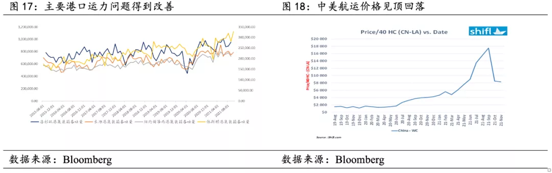 港口淤積方面,10月13日,拜登政府要求洛杉磯港和長灘港 24H/7D 模式運營。 11月16日開始,美國加州太平洋商船協會(PMSA)對港口施行了船隻排隊新規,要求船舶在等待港口泊位時,東行船必須保持在南加州海岸以西150英里處(而非擁堵在港口),而北行和南行船隻必須保持距離加州和墨西哥50英里以上。 進入洛杉磯港、長灘港(兩港合計佔美國40%貨運量,2/3的集裝箱)的船隻,將依據離開上一個停靠港口的時間排隊。 根據新政策,洛杉磯港和長灘港將針對卡車運輸與鐵路運輸超期的集裝箱,向海運公司收取100美元/箱的附加費,並且每天每個集裝箱增加100美元,直到該集裝箱離開碼頭為止(后因為堆積改善,暫緩執行)。 自宣布收費以來,集裝箱加速離開港口,堆積在港口的舊貨物減少了33%,排隊的船隻數量減少25%,但依然處於高位。 航運價格方面,根據貨運追蹤公司Freightos數據,截至11月5日,中國-美國東海岸航線每個集裝箱運價達到19,895美元,低於9月上旬22,173美元的高點。 另據集裝箱數據公司Shifl數據,從中國到洛杉磯的40英尺箱的即期價格已從9月的17,500美元暴跌至10月初的8,500美元,降幅超過50%。