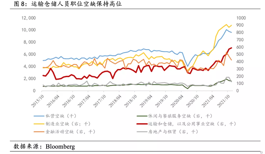 目前,美國個人儲蓄規模恢復到歷史平均水準,後續商品消費刺激力度有限,港口貨運需求未見減少,但淤積情況在政策疏導下有所好轉。 卡車司機職位空缺處於高位,隨著就業復甦,後續缺口有望得到改善,對部分商品的通脹壓力有所緩解,但Omicron變異病毒造成的影響給未來供應鏈修復進程帶來了諸多不確定。