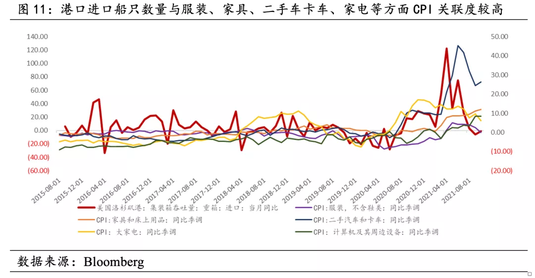 美國消費商品中,汽車、傢俱、服裝主要來自進口,以2020年數據為例,美國銷售的服中進口佔比為90%,美國傢俱中進口佔比為60%,銷售汽車中進口佔比48%。 港口船隻積壓與此類商品的通膨呈顯著相關性。