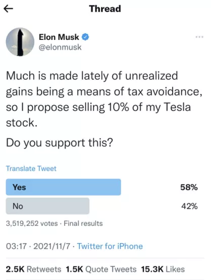 於是,馬斯克11月7日在推特上發起投票,就是否出售10%特斯拉股票詢問粉絲意見。 結果顯示,58%的網友支援其出售股票。