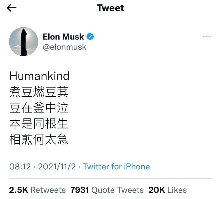 最著名的就是"七步詩"。 11月2日,在馬斯克個人財富增至3000億美元后,聯合國世界糧食計劃署官員呼籲其捐款,以拯救陷入饑餓的人們。 隨後馬斯克即在推特上用中文發佈了曹植的七步詩:煮豆燃豆萁,豆在釜中泣。 本是同根生,相煎何太急。