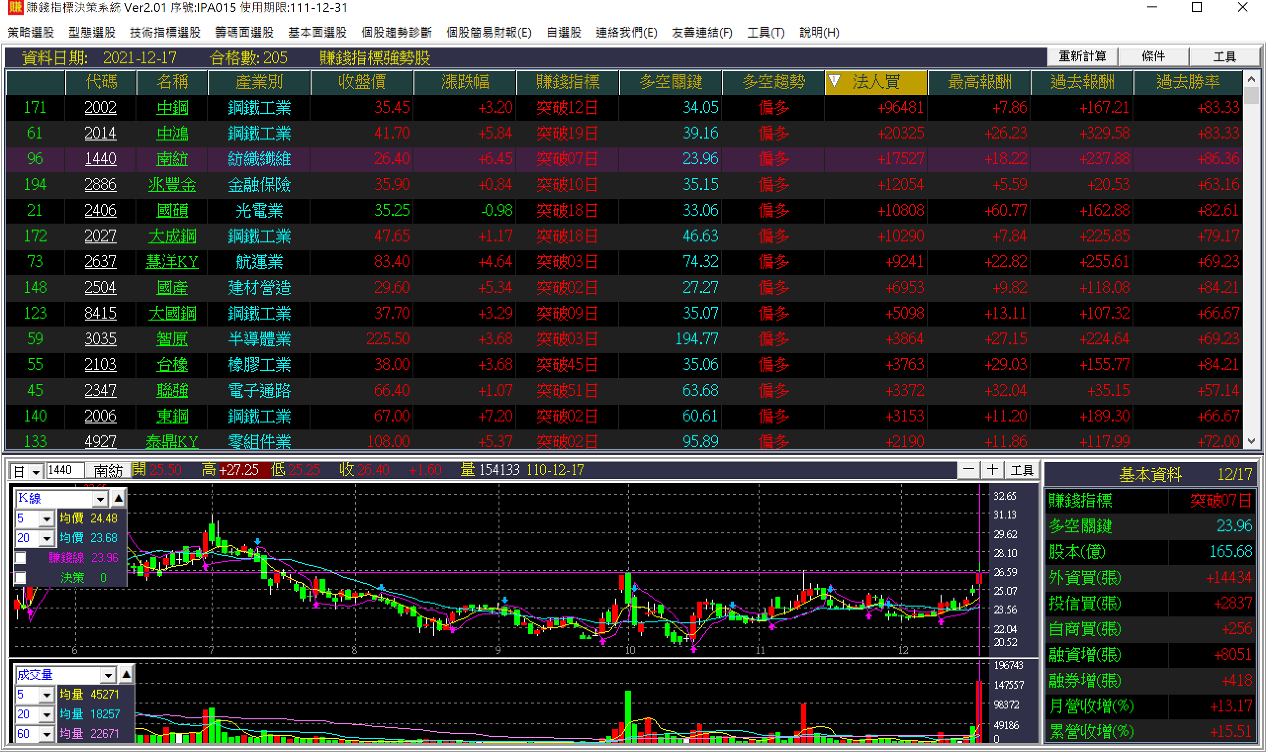 過新高或回檔,這兩週見分曉J董2021/12/19•加權指數目前仍舊站在周線之上,量能逐步放大,投信也連續大買了4日,這邊的隱憂就是週五提到的美期,小Nasdaq是否能在目前的支撐區撐住?小道瓊也到了高檔壓力位置開始休息,台股是相對強勢的,這邊只要守住再上攻,過新高的機率很大!明天的「多空關鍵」位置在17833,只要收盤上漲超過22點,就會翻轉為『賺錢指標』突破訊號第1天!! 貼圖2:『賺錢指標』強勢股且法人買超的篩選排序底部出量長紅、帶量長紅突破新高站上,都是值得注意的股票! #技術分析#加權指數58人讚留言分享