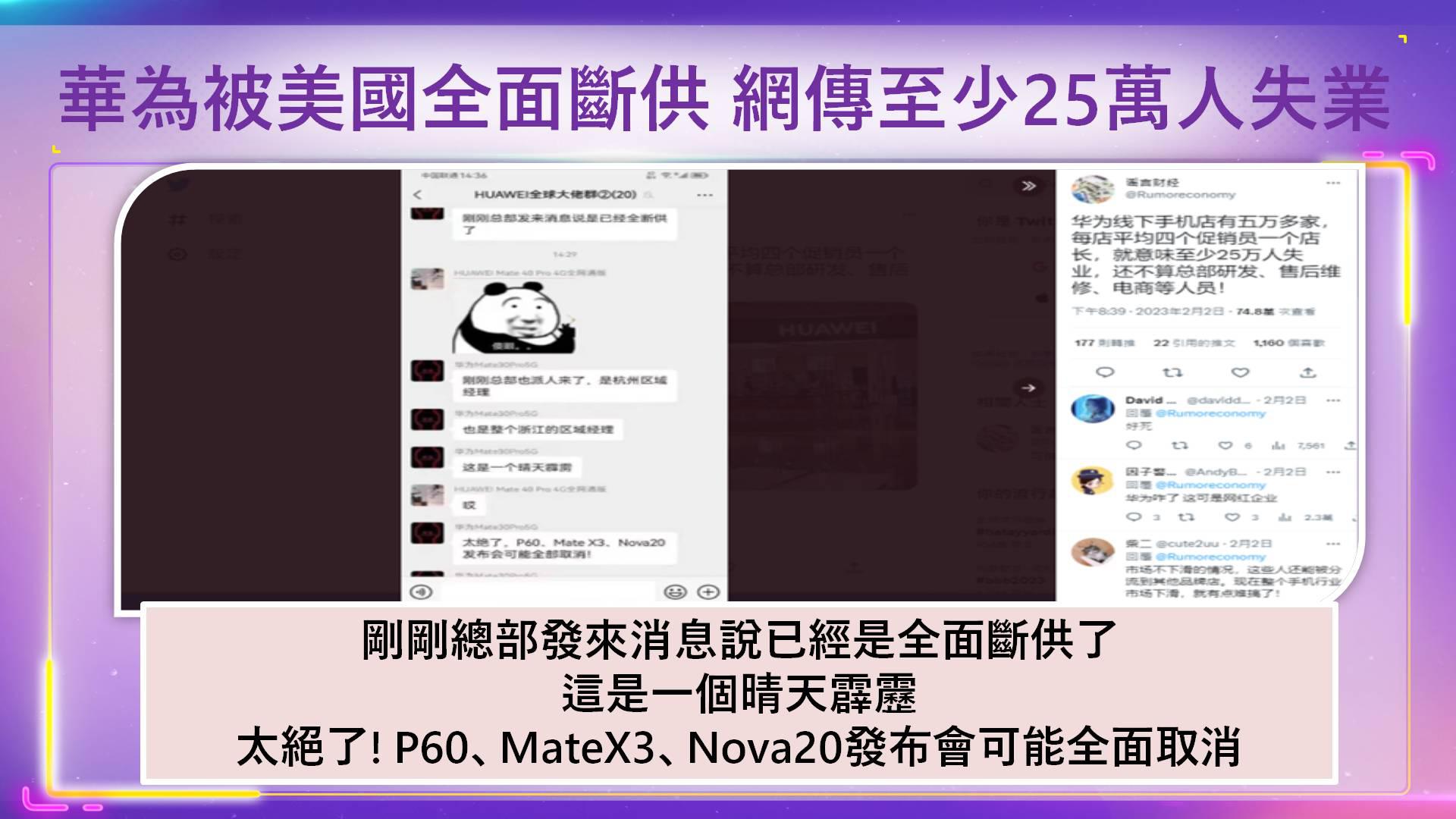 拜登政府近日傳出已對美企停發供貨華為的許可證。中國網友「小布在未來生活」表示,美國將停止向華為供應包括4G、WiFi 6和7、人工智慧與高性能計算、雲端計算等領域產品。推特帳號「謠言財經」貼出一張「華為全球大佬群」的聊天紀錄,內容提到華為總部:包含杭州區域經理、浙江區域經理都已發出「全面斷供」消息,其P60、MateX3、Nova20等手機的發表會可能全面取消;華為線下手機店有五萬多家,每店平均四個促銷員一個店長,等於至少廿五萬人失業,還不算總部研發、售後維修、電商等人員。華為 P60 Pro新機將再MWC展推出,但買氣問題,成為市場疑慮,拜登斷供直接影響華為員工與華為經銷商生計,也是中國失業率隱憂。