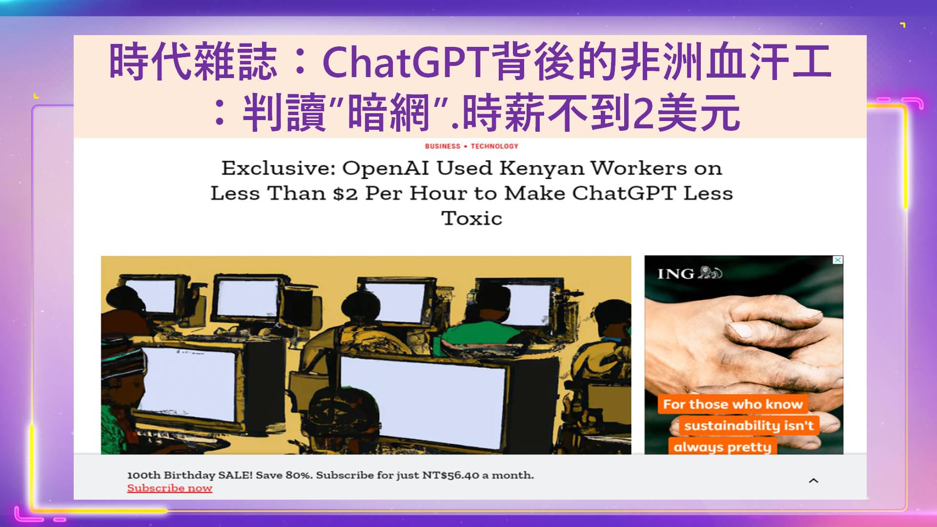 據《時代雜誌》於1月18日:OpenAI 僱用了時薪1.32美元至2美元之間。時薪不到2美元的肯亞外包勞工來訓練ChatGpt,他們負責的工作是對龐大的數據庫手動進行數據標註,被稱為「數據標註員」;這份工作除了薪資被剝削外,也需長時間接觸性虐待、酷刑和亂倫等文本,因此留下心理創傷。