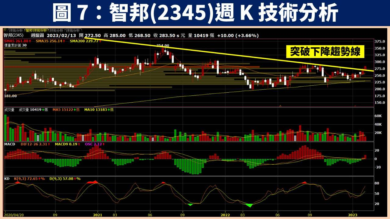 在技術分析方面,智邦(2345)近期股價出量突破 2022 年 10 月以來所形成的 W 底頸線位置,顯示近期雲端業者下修資本資出的利空逐漸淡化,且從週 K 線圖來看,亦突破長期以來的下降趨勢線,買盤轉趨強勁!