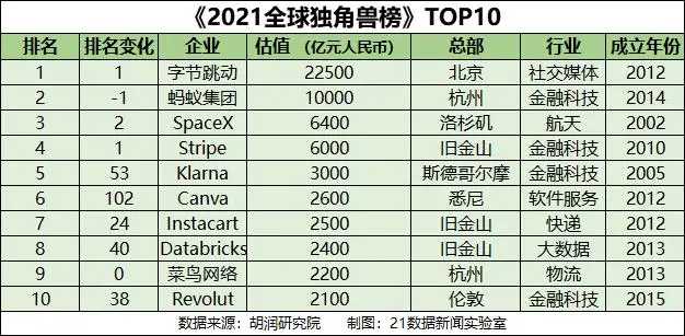 榜單範圍為全球成立於2000年之後價值10億美元以上的非上市公司,估值計算截止日期為2021年11月30日。