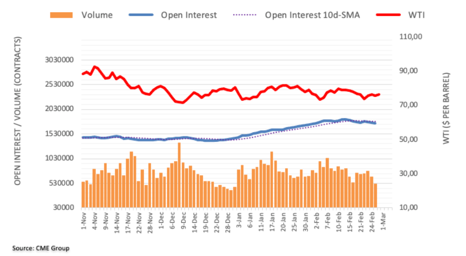 CME集團的原油期貨市場初步數據指出,週一交易商連續第三天增加了他們的未平倉合約,當日增加了約0.66萬份。同樣的,成交量連續第二個交易日萎縮,當日減少約14.67萬份合約。