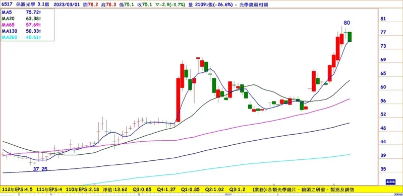 從雷虎和八貫的例子可以發現,這兩家過去都是相對冷門,成交量也不大,產業也不太被大家所注意的公司,但是一切入軍工產業後,股價都是翻倍大漲,那台股當中還有類似的公司嗎?去年12/15才掛牌的保勝光學(6517)就可以注意,保勝光學是國內少數以製造大尺寸玻璃光學透鏡為主的光學廠,多年來聚焦在少量多樣、客製化、高階與高附加價值光學鏡頭市場,包括劇院、電影院、天文、醫療、運動等等利基市場,月產能約60~100萬套,並採用ODM或OEM商業模式,近年切入生產用在醫療上的鏡頭模組及鏡片。
