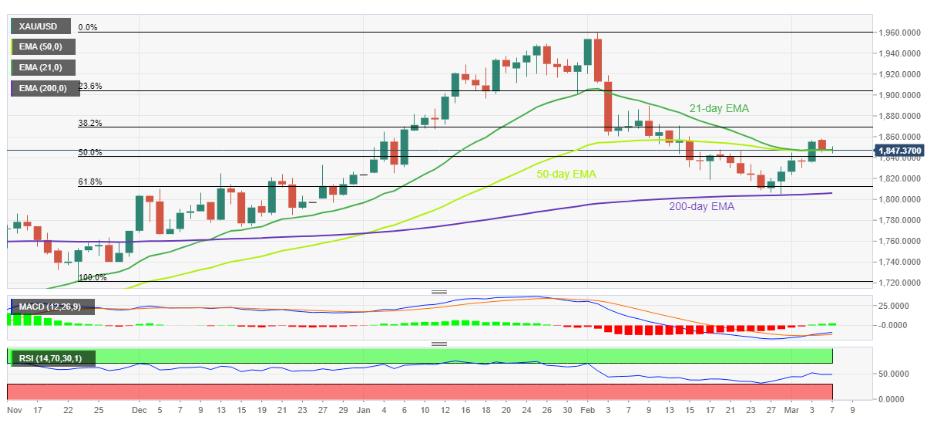 金價正交投於21日和50日指數移動均線(EMA)匯合點1848美元附近。