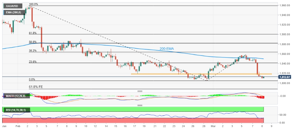 在金價跌破1800美元整數關之後,2月2日至3月6日期間金價走勢的61.8%斐波那契回撤位約1787美元左右,可能會引誘黃金熊市。