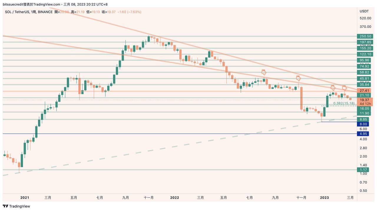 SOL 在這波熊市之中最高點回落 -96.92%,雖然表現不佳,但相較於歷史價位來看,還是墊高了不少,再仔細觀察,在 FTX 事件發生之前,價格是守在 27.41 這個支撐,1、2月的回漲卻被擋在這個價位,是經典的支撐轉壓力,不太樂觀。