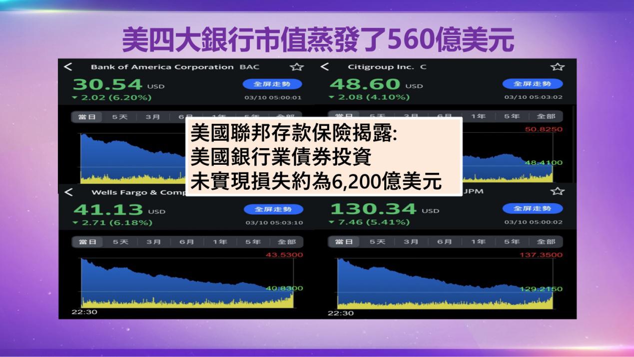 摩根大通(JPMorgan Chase & Co.)、美國銀行(Bank of America)、富國銀行(Wells Fargo)、花旗(Citigroup)分別重挫5.41%、6.20%、6.18%、4.10%。