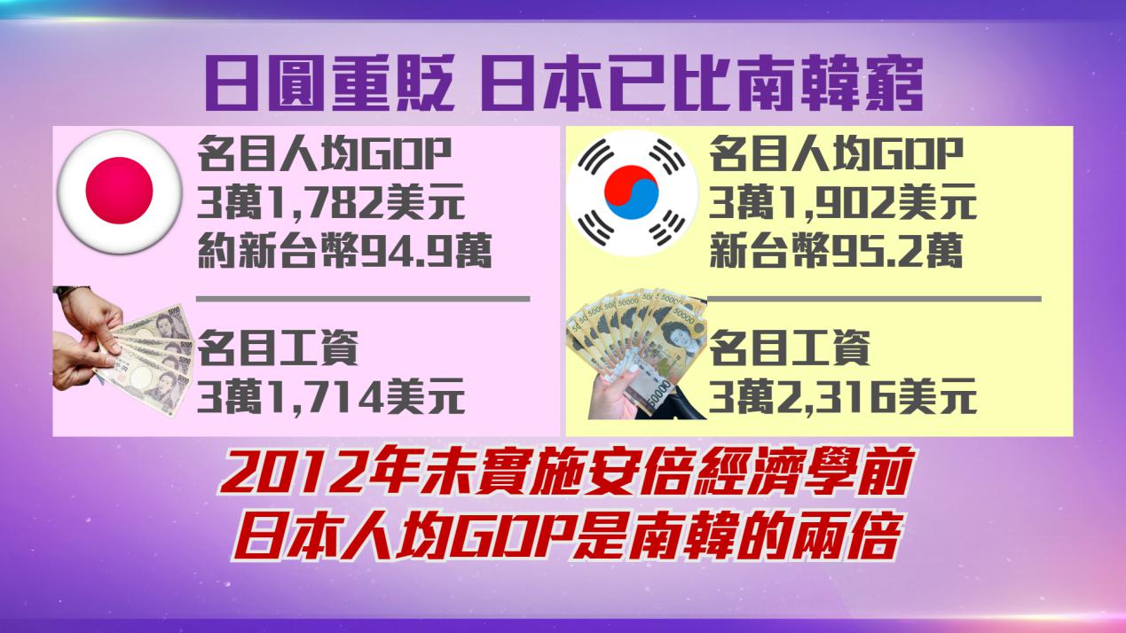 日本經濟研究中心2022年12月14日:日本人均名目國內生產毛額(GDP),將分別在2022年落後台灣、2023年低於韓國,直接的因素從2021年底到2022年,日圓貶值了超過20% -個人的財富中持有日圓,就是少了超過5分之1。