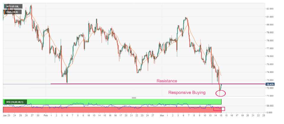 下降的20週期指數移動均線(EMA)處在在73.56美元附近,表明WTI油價仍傾向於下跌。