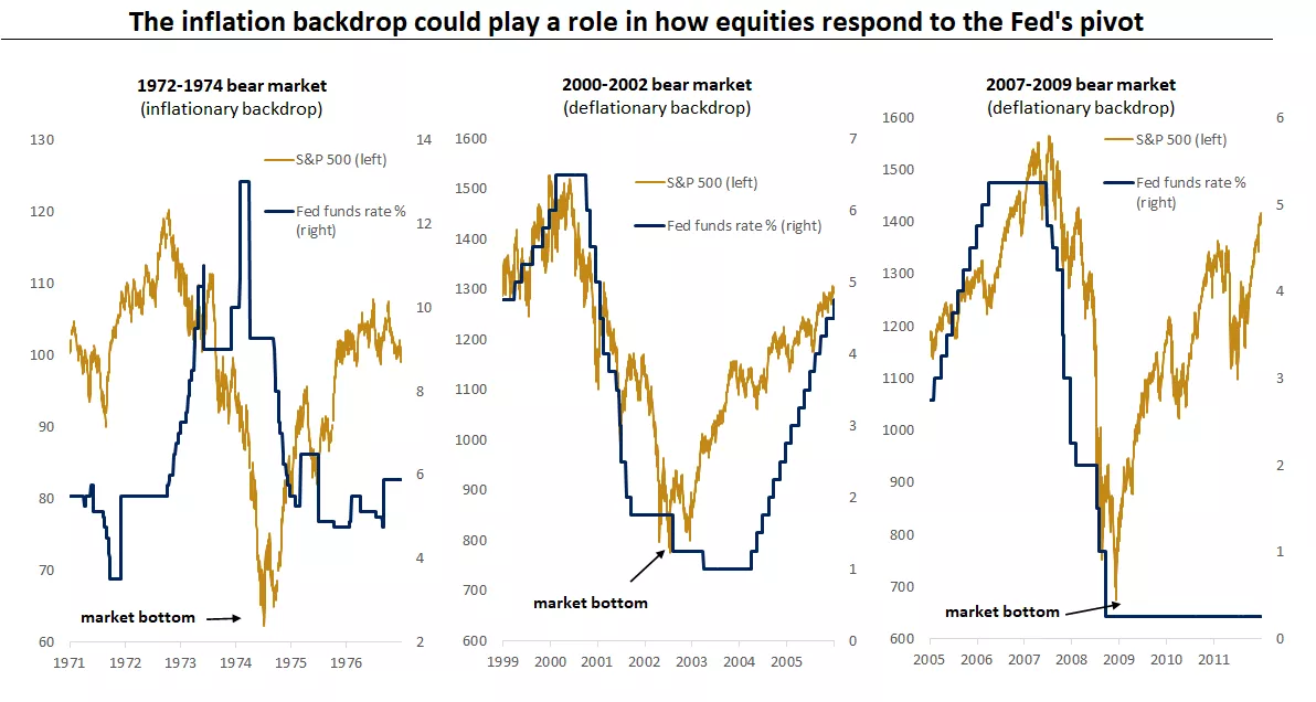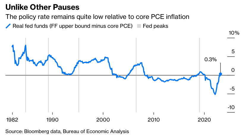 市場有看法認為聯邦基準利率已高於核心 PCE,但 Bloomberg 分析,兩者的差值仍遠低於歷次停止升息的情況 (圖 1-9),且 2 年、10 年期國債利率已較 Fed Fund 低不少,加上股市 Q1 已上漲 7%,預測本次停止升息,Forward P/E 上調有限、股市上漲空間有限