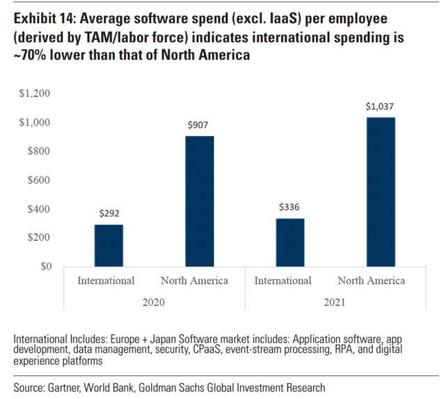 考慮到全球勞動力的國際組合,我們根據歐洲和日本的勞動力分析出企業軟件總體規模(不包括IaaS),計算出每人每月平均花費為78美元。