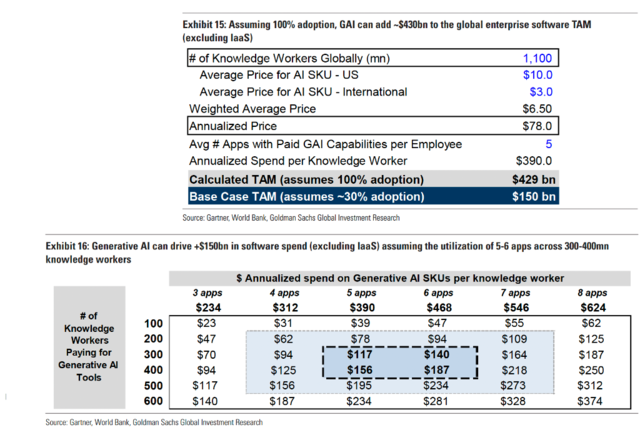 高盛按照知識工作者基於生成式AI滲透率進行分析,假設當今11億知識工作者,每人運用5個生成式AI應用程序,每月平均花費78美元,企業軟件總體規模將達到4290億美元。