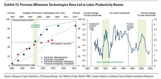 高盛認為,在生成式AI的加持下,工作流程將被大幅簡化,生產力得到提振,在生成式AI發展的10年內,預計每年可以將生產力提高超1.5%: