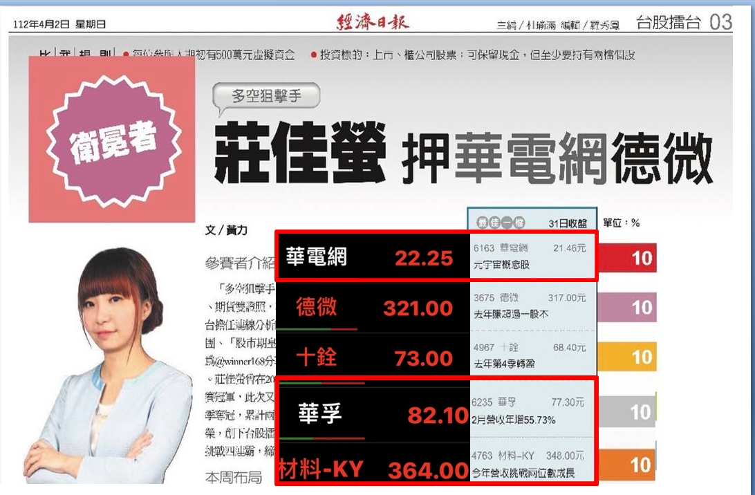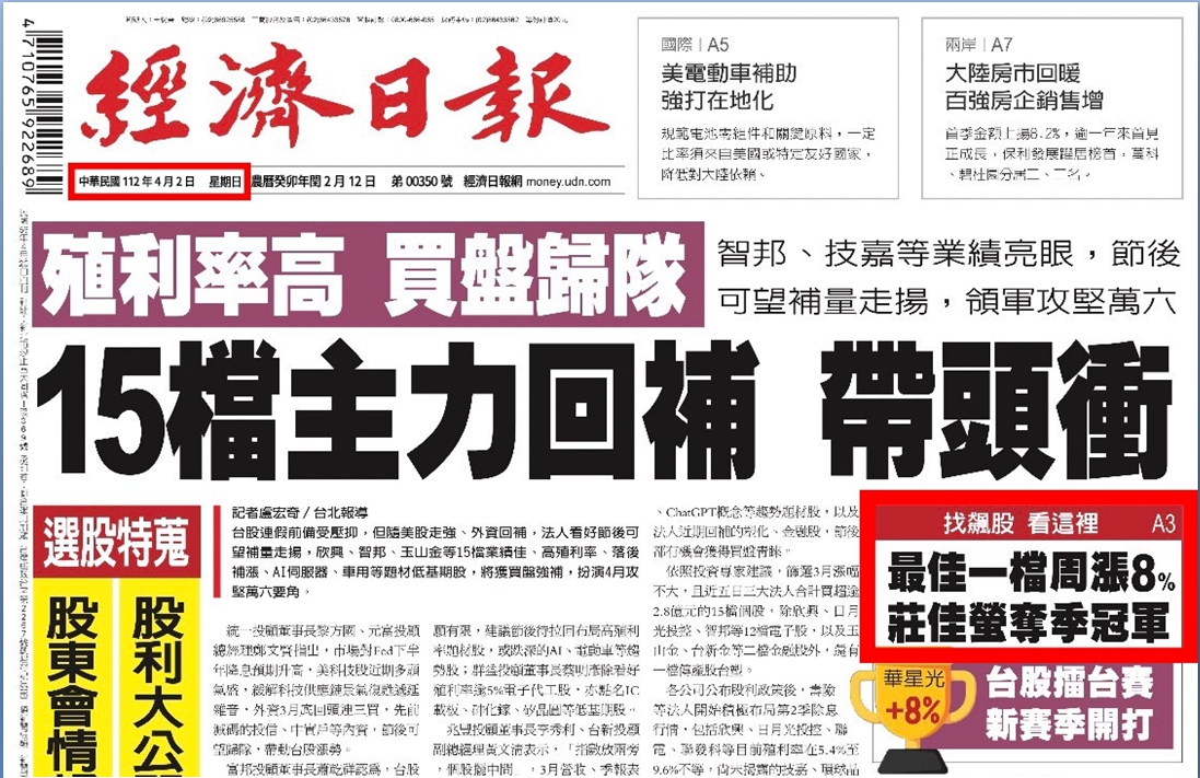 而2023年Q1佳螢老師勇奪經濟日報連三季選股冠軍!並登上經濟日報頭版!