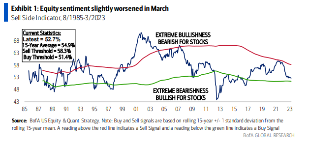 BofA 策略師 Subramanian 表示,華爾街分析師對股票配置的共識是可靠的反指標,極度看空時反而是看多指標,BofA Sell Side Indicator 在 3 月底為 52.7%,距離買入位置僅差 1.3% (圖 2-1),即使目前買入12 個月上漲機率為 94%、報酬中位數高達 22%