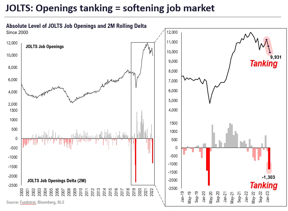 Fundstrat 的 Tom Lee 則認為銀行危機不如想像嚴重,緊繃的勞動力市場已開始緩解 (圖 1-2),4 月季節效應有利於股市繼續上漲,維持 S&P 500 年底目標價 4,750