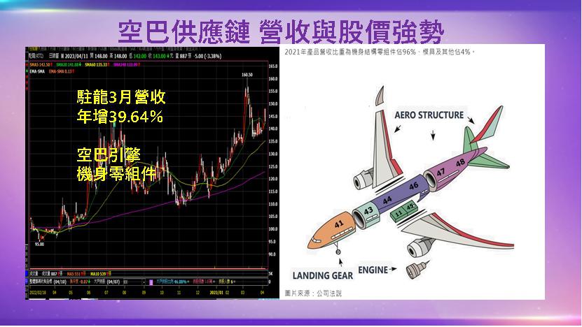 駐龍是波音系的供應商,在空巴部分僅透過賽峰打進LEAP-A 引擎的結構件,生產及銷售大型飛機『機身結構零組件』、『引擎結構零組件』、『起落架零組件』,海外客戶還有法國賽峰集團(Safran Group),Safran就類似美國的GE,透過Safran供應給空中巴士。自2023年3月合併營收7,101萬元、年增39.64%,第一季合併營收1.91億元、年增58.25%。
