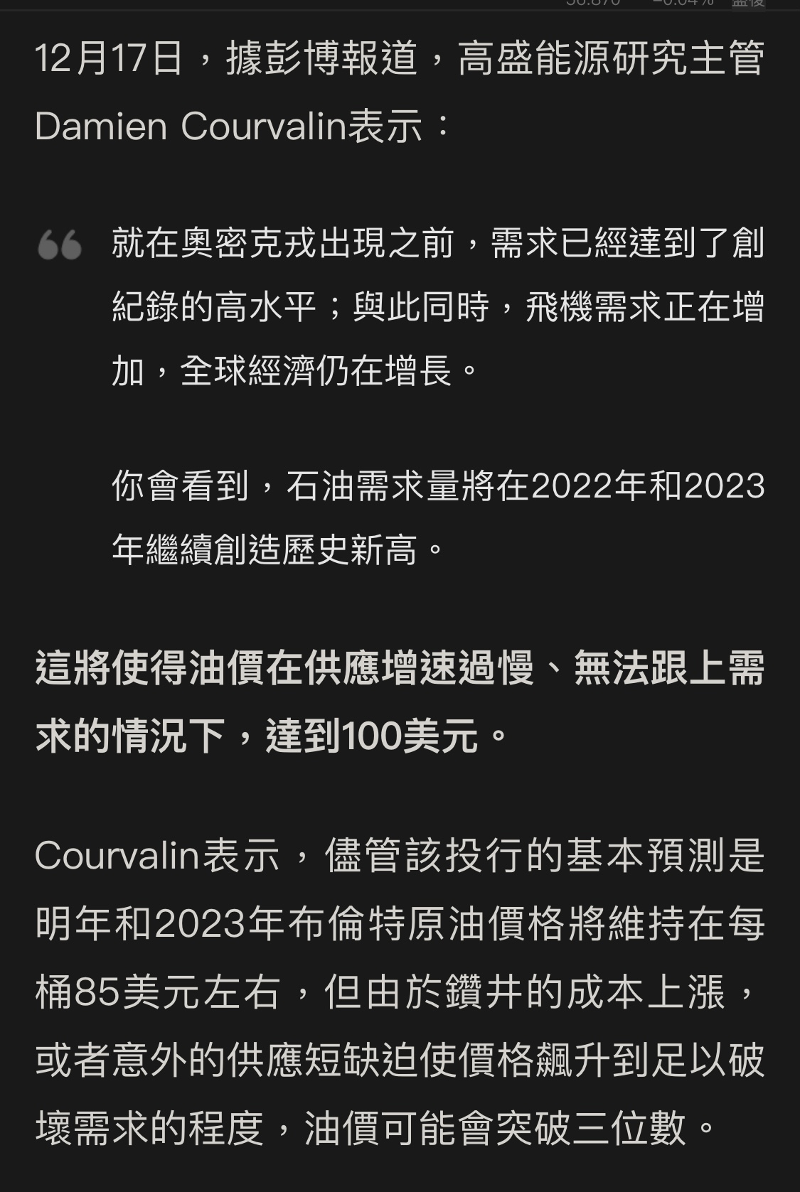 去年12月17日高盛不給拜登面子,在Bloomberg 說供不應求、油價可能破百,認為油價要到$110~$120才會對需求產生影響