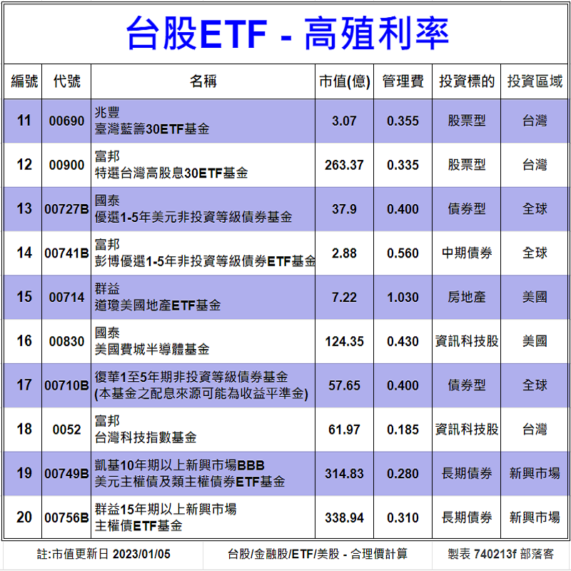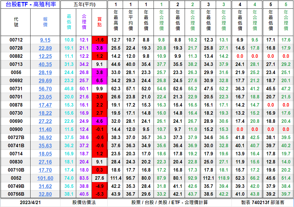 台股 - ETF - 高殖利率 - 估價[20檔]