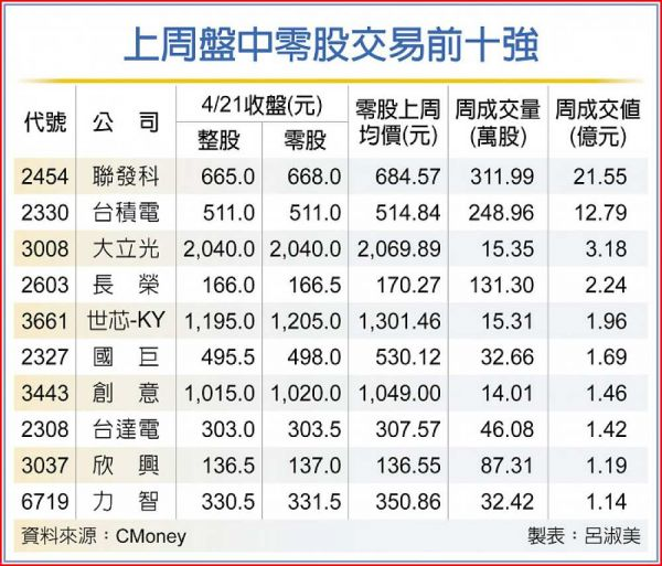 篩選上周集中市場盤中零股交易前十高股,依序為聯發科、台積電、大立光、長榮、世芯-KY、國巨、創意、台達電、欣興及力智等,除聯發科中零股交易大爆發,衝上21.55億元之外,再來是向來常是台股盤中零股交王的台積電12.79億元,其餘都是1億~3億元以上。