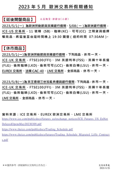 2023/5/1(一) 為歐洲勞動節與英國銀行假期、5/08(一)為歐洲銀行假期,ICE-US交易所-11號糖 (SB)、咖啡(KC)、可可(CC) 之期貨與選擇權商品,將延後至台灣時間晚上19:30開盤(紐約時間 07:30AM)。