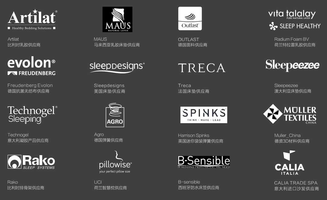 在材質領域,提供優質乳膠枕的意大利TECHNOGEL ITALIA SRL、世界領先內彈簧製造商德國AGRO International GmbH & Co. KG、製造崔佧床墊的法國CENTRE BEDDING SAS/ALSACE BEDDING SAS.....一眾優質國際供應商代表印證了慕思對原材料的認真與嚴謹。