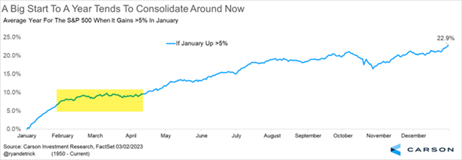 Carson Research 研究顯示,S&P 500 若在 1 月上漲超過 5%,3、4 月將表現平平,但 4 月下旬到 5 月中趨勢為上漲,5 月中下旬則將進入整理 (圖 1-14)