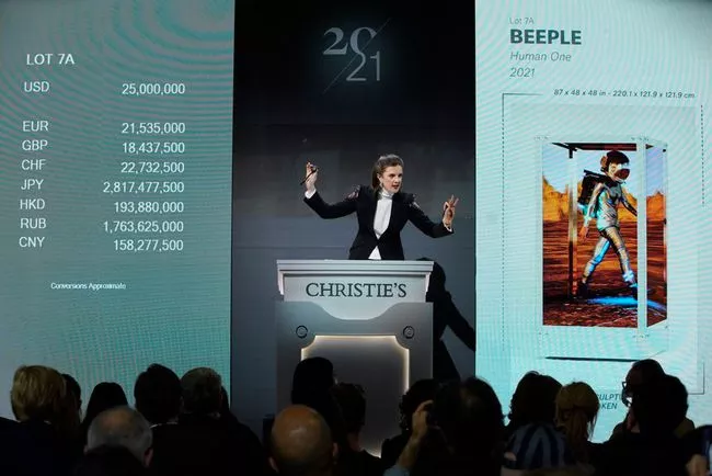 2021年3月份,英國拍賣行佳士得首次上拍NFT作品。 美國數位繪畫藝術家Beeple創作的NFT作品《Everydays: The First 5000 Days》起拍價為100美元,上架後一個小時內價格便攀升至100萬美元,經過353口叫價,歷時15天,最終以6935萬美元成交,而該作品也成為在世藝術家作品拍賣史上價值第三高的藝術品。