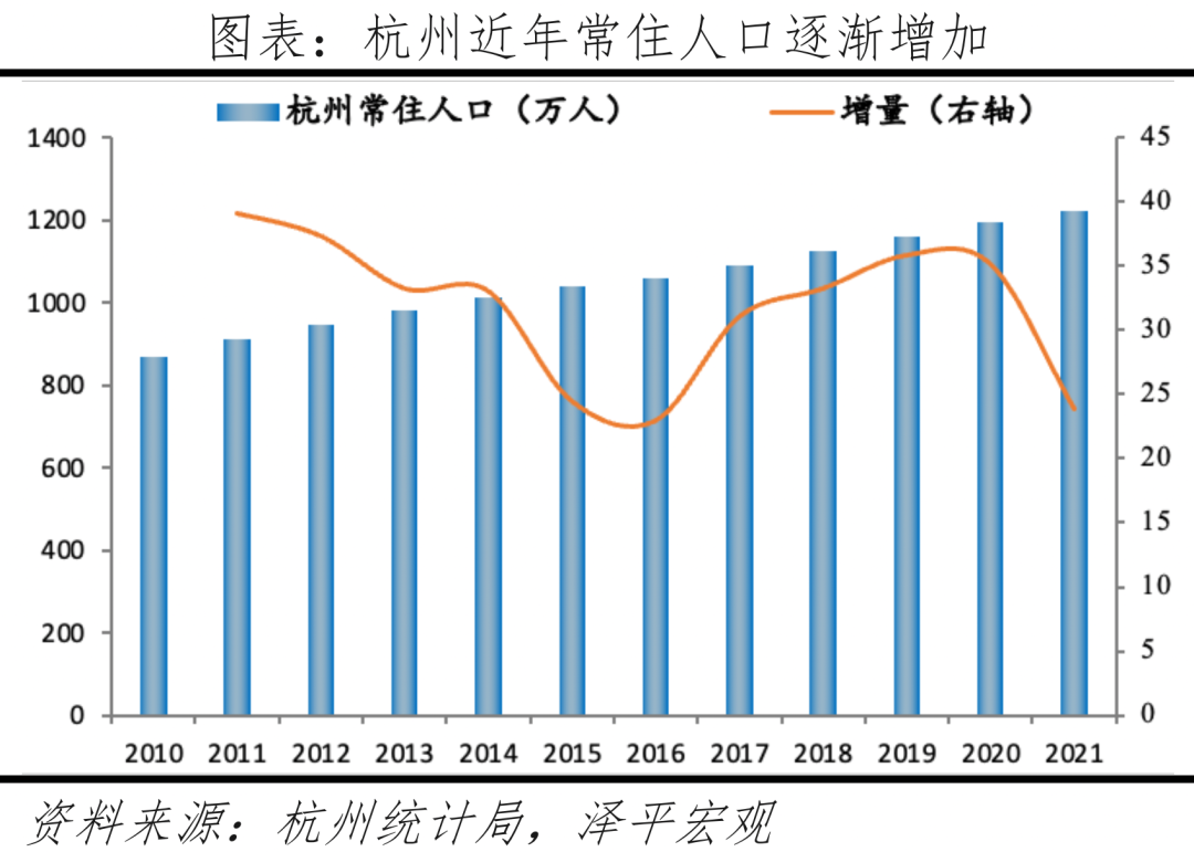 杭州經濟發展勢頭良好,近五年常住人口年均增量長三角第一。“東南形勝,三吳都會,錢塘自古繁華”,歷史上的杭州得益於京杭運河和通商口岸的便利,以及自身發達的絲綢和糧食產業,成為重要的商業集散中心。改革開放後,依托鐵路以及上海在進出後貿易方面的帶動,杭州輕工業發展迅速,民營經濟活躍。2000年杭州開始大規模城市改造,大量資金流向杭州,推升杭州房價步入全國第一梯隊。但由於杭州房價上漲過快,加之2008年金融危機影響,杭州房價一直陰跌至2015年低谷。隨著阿里巴巴、網易等高科技企業的帶動,互聯網經濟成為杭州新的經濟增長點。2016年G20峰會後,杭州的國際化水平和影響力大幅提升。2016-2021年,杭州經濟增長超60%,位列十大城市第二,近小幅低於成都。2021年杭州GDP達1.8萬億;城鎮居民人均可支配收入7.5萬,全國第4,絕對購買能力強。從上市公司數量看,A+H股上市公司杭州有189個,全國第四,僅低於北上深。近五年杭州常住人口年均增量為長三角第一。