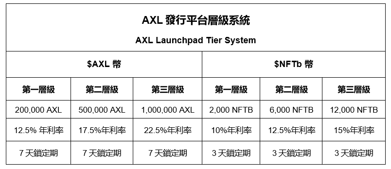 發行平台層級機制的配置方式是,擁有較高額的$AXL和$NFTB持有人,能夠享受額外的益處。