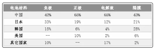 在電池材料製造方面,中國在負極、正極、電解液、隔膜等材料的製作上分別占比42%、65%、65%、43%。