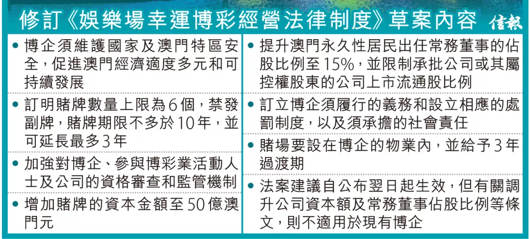 根據修訂草案,博企須在維護國家及澳門特區安全下營運;訂明賭牌數量上限為6個,禁發副牌;賭牌期限不多於10年並可延長最多3年;增加賭牌資本金至50億澳門元;提升澳門出任的常務董事的占股比例至15%;並限制承批公司或其屬控權股東的公司的上市流通股比例等等。